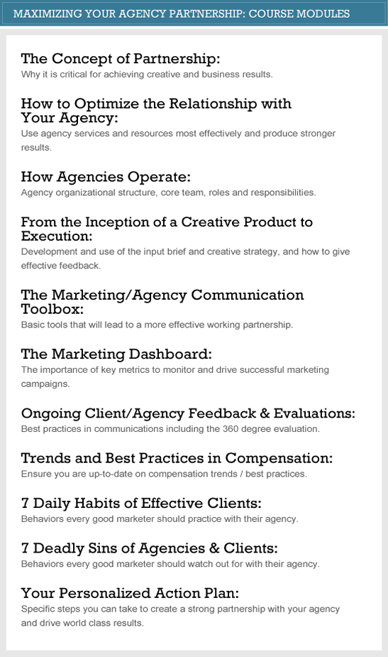 Real-world case studies, group interaction strategies, role-play techniques and a personalized action plan for your people offer powerful insights into what it takes to build a world-class partnership that empowers your agency to deliver groundbreaking work that produces powerful marketplace results.